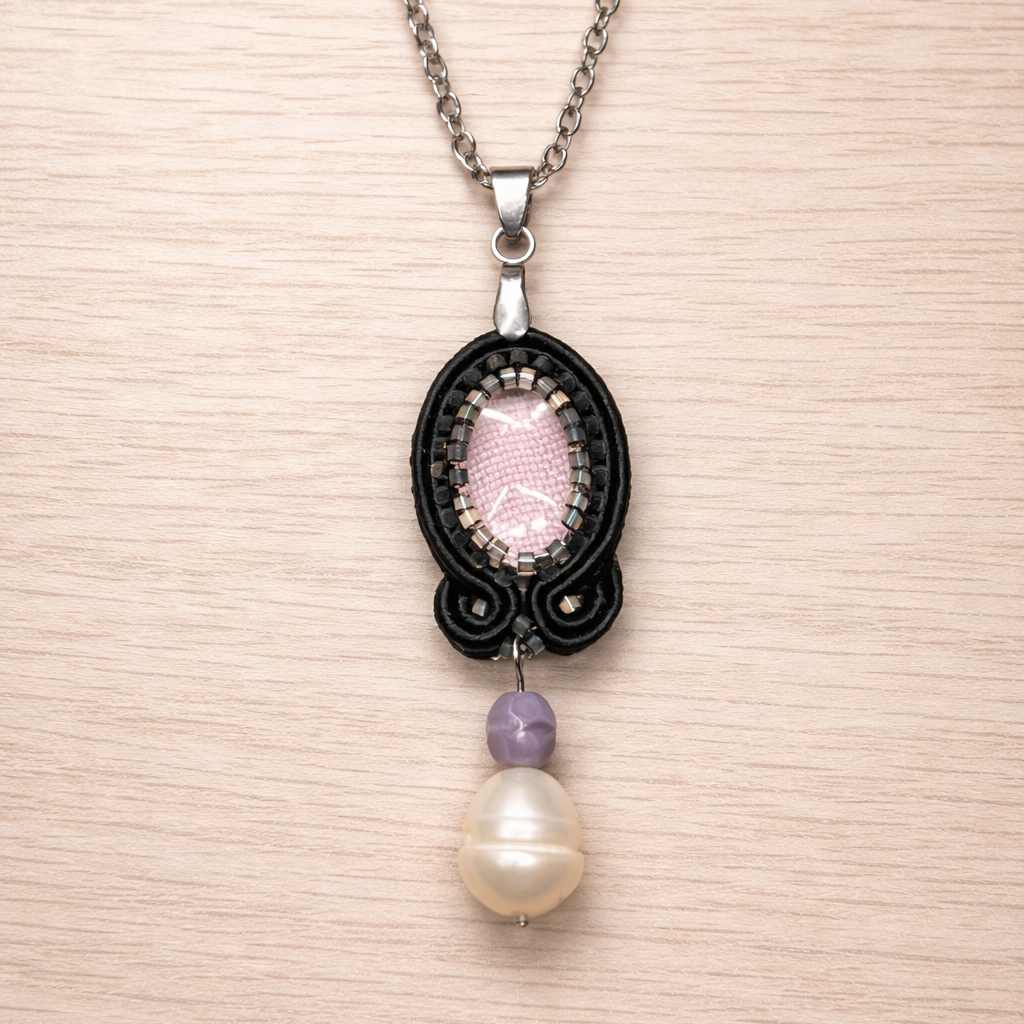 DISEÑO ÚNICO: cordón negro + perla barroca + abalorio de cristal a juego de la tela recibida.